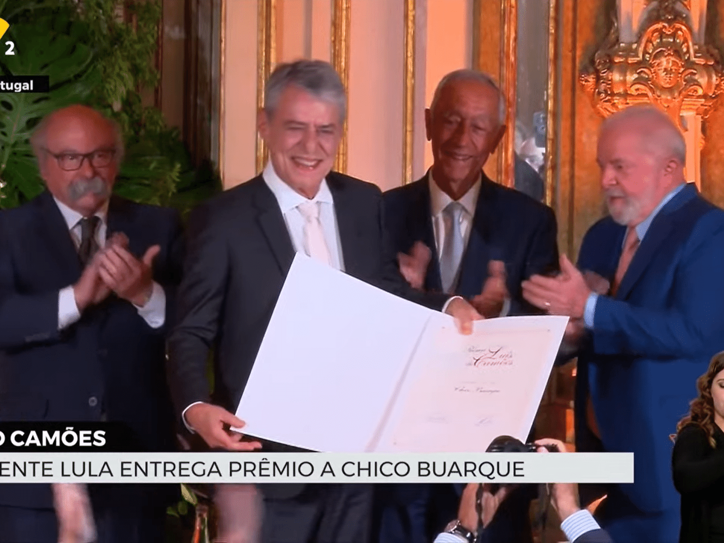 O presidente Luiz Inácio Lula da Silva e o presidente de Portugal, Marcelo Rebelo de Sousa, entregaram o Prêmio Camões, o principal da literatura em língua portuguesa, ao músico, dramaturgo e escritor brasileiro Chico Buarque. A cerimônia ocorreu nesta segunda-feira (24), no Palácio Queluz, em Lisboa.