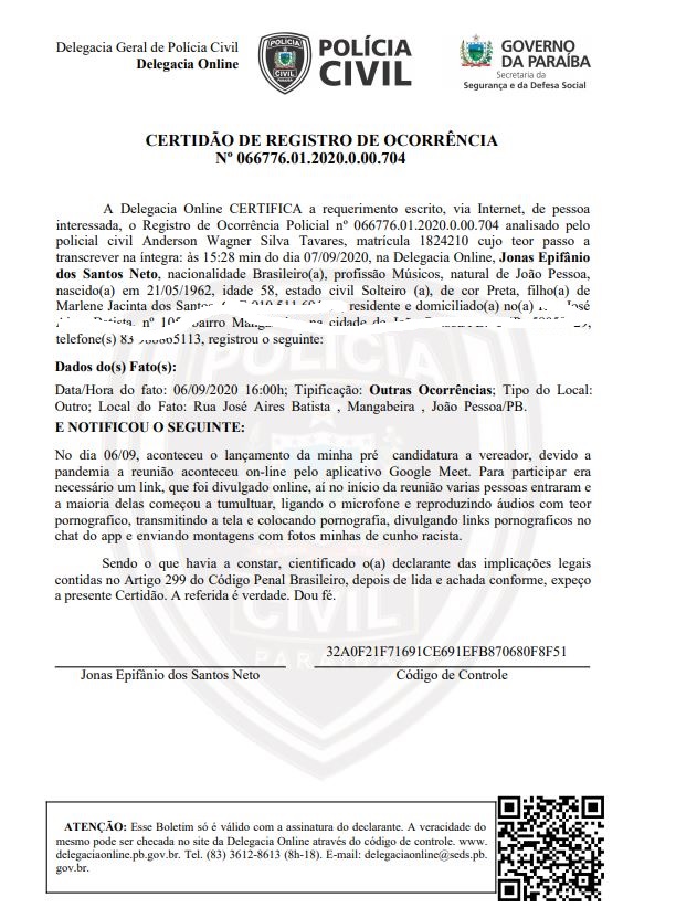 “Acabei de entrar com uma representação pedindo providências. O motivo é decorrente do acontecimento do último domingo quando na atividade on line, decorrente da pré-candidatura de Escurinho a vereador em João Pessoa foi invadida, sendo inciados ataques racistas, publicação de material ponográfico, elogios ao anti-presidente Jair Bolsonaro, um verdadeiro ataque ao estado democrático de direito. O PSOL nacionalmente tem sido vítima dessa ultradireita”, informou.