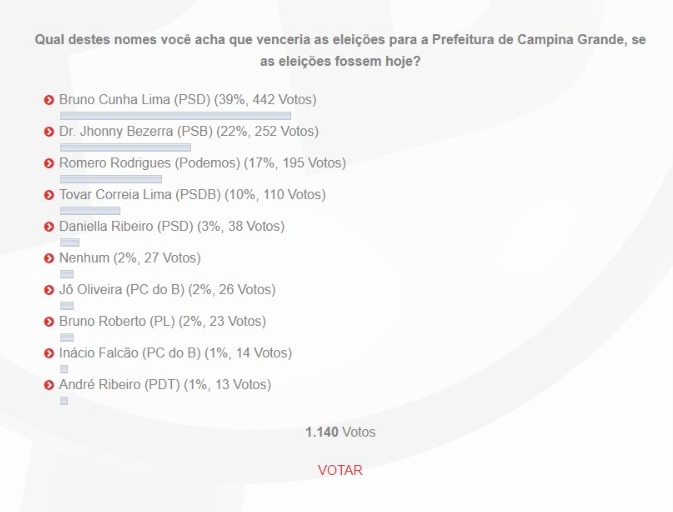 Dos dias 01 a 06 de novembro, o site Bastidores da Política PB realizou a segunda enquete do ano de 2023 para saber a opinião de nossos leitores sobre as eleições de 2024 em Campina Grande, perguntando: ‘Qual destes nomes você acha que venceria as eleições para a Prefeitura de Campina Grande, se as eleições fossem hoje?