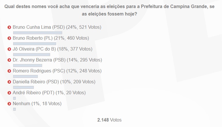 Em primeiro lugar ficou o atual prefeito, Bruno Cunha Lima, com 24% (521 votos). Em seguida aparece o empresário Bruno Roberto, com 21% (460 votos), seguido da vereadora Jô Oliveira com 18% (377 votos).