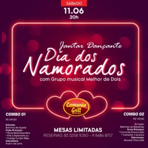 O Camarão Grill, após dois anos sem poder realizar um dos mais tradicionais jantares românticos da Paraíba em homenagem aos namorados, por causa da pandemia, retoma o evento com novidades no dia 11 de junho, a partir das 20 horas.