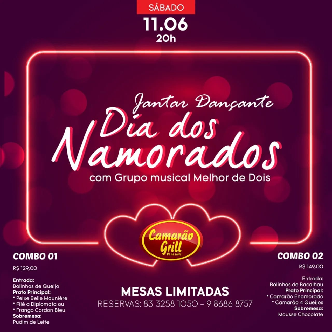 Ele lembra que as mesas são limitadas e revela que preparou dois combos incríveis para que essa noite seja inesquecível. Quer saber mais detalhes? Ligue para fazer a reserva e/ou obter informações no 3258-1050 / (83) 98686-8757 e (83) 98208-1020.
