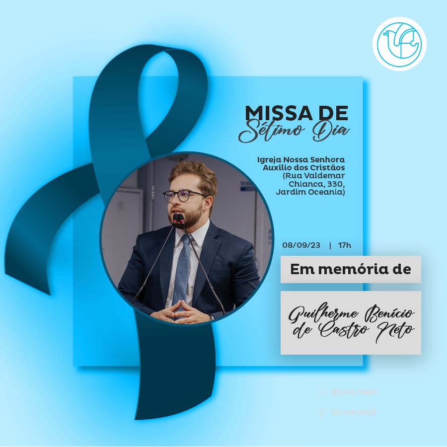 Familiares, amigos e parlamentares convidam para a missa de sétimo dia do falecimento do secretário Legislativo da Assembleia Legislativa da Paraíba (ALPB), Guilherme de Castro, que vai acontecer nesta sexta-feira (8), às 17h. A cerimônia será na Igreja Nossa Senhora Auxílio dos Cristãos, na Rua Valdemar Chianca, 330, Jardim Oceania, em João Pessoa.