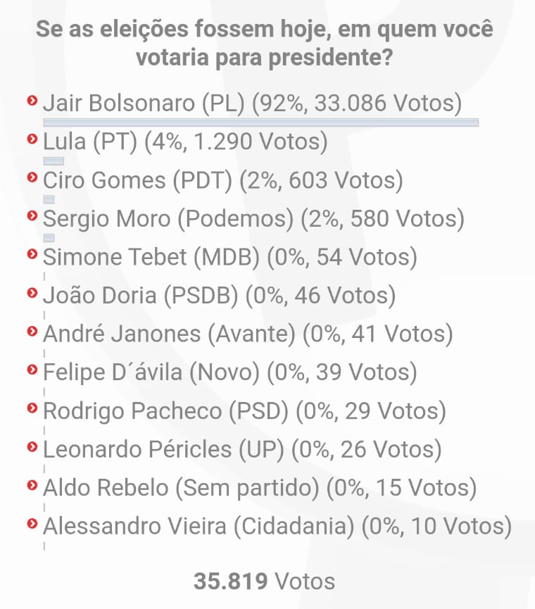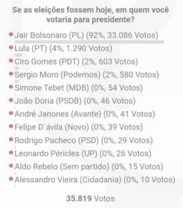 O resultado da nossa enquete traz na liderança o atual presidente Jair Bolsonaro com 33.086 votos (92%). Em segundo lugar, ficou o ex presidente Luis Inácio da Silva, Lula, com 1.290 votos (4%). Em terceiro lugar ficou o pré-candidato Ciro Gomes com 603 votos (2%) e o ex-juiz federal Sérgio Moro com 2%, obtendo 580 votos. Os demais candidatos não pontuaram percentualmente.