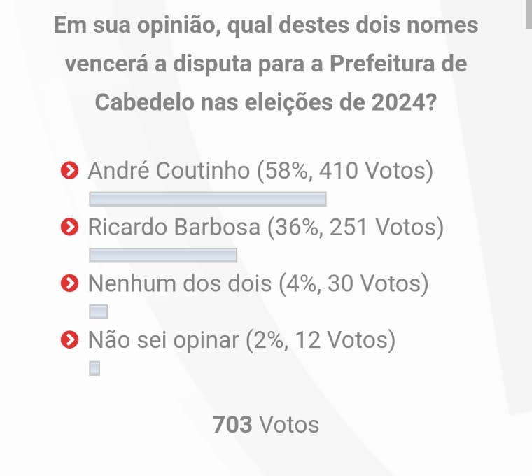 Nos dias 25 e 26 de outubro, o site Bastidores da Política PB realizou mais uma enquete para saber a opinião de nossos leitores sobre as eleições de 2024 na cidade de Cabedelo, perguntando: Em sua opinião, qual destes dois nomes vencerá a disputa para a Prefeitura de Cabedelo nas eleições de 2024?