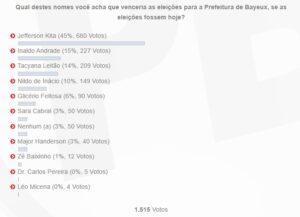 Na primeira colocação aparece Jefferson Kita, com 45% (680 votos). Em segundo lugar figura o ex-vereador Inaldo Andrade com 15%(227 votos). Já em terceiro lugar Tacyana Leitão fecha a lista dos três primeiros com 14% (209 votos).