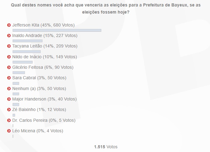 Confira o resultado da primeira enquete: [RESULTADO] Enquete revela quem assumiria a prefeitura de Bayeux se as eleições fossem hoje; confira
