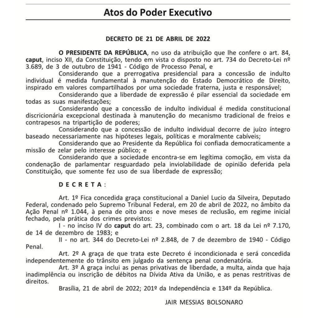 Em sua live, Bolsonaro disse que ‘o decreto vai ser cumprido’ e que a sociedade está ‘em legítima comoção’ em vista da condenação do parlamentar resguardado pela inviolabilidade de sua opinião. “Fica concedida Graça Constitucional a Daniel Lúcio da Silveira, deputado federal, condenado pelo STF, em 20 de abril de 2022, no âmbito da Ação Penal 1044”, diz o decreto.